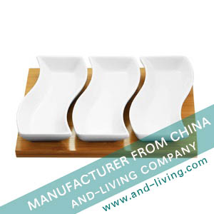 3-PC RECTANGULAR PORCELAIN SERVER W/ BAMBOO TRAY
