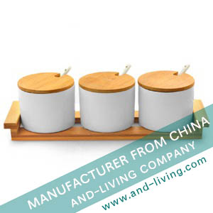 3-PC CONDIMENT SET W/ BAMBOO LID AND PORCELAIN SPOON AND BAMBOO TRAY